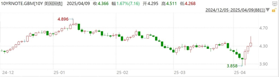 4月9日,截至北京时间16:39,10年期美债收益率盘中最高触及4.51%,与4月4日盘中3.86%最低收益率相比,上行约65基点,3天之内上行超60基点,波动幅度可谓巨大。